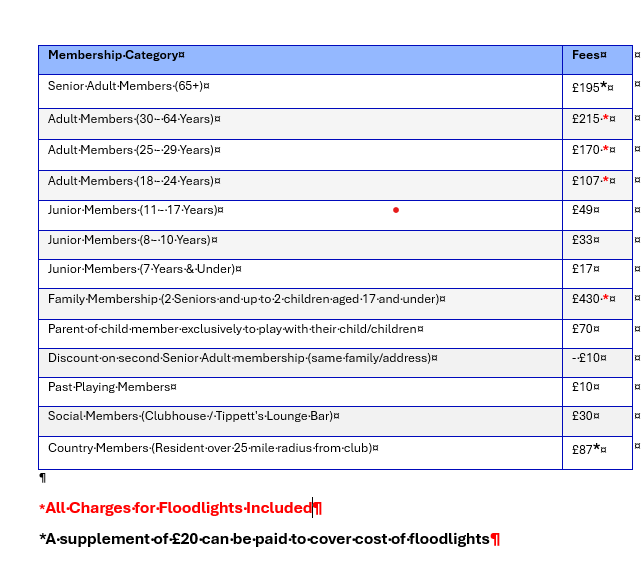 - For the 2025/26 season a £20 supplement for floodlights is included in membership fees for 18-64 year olds.